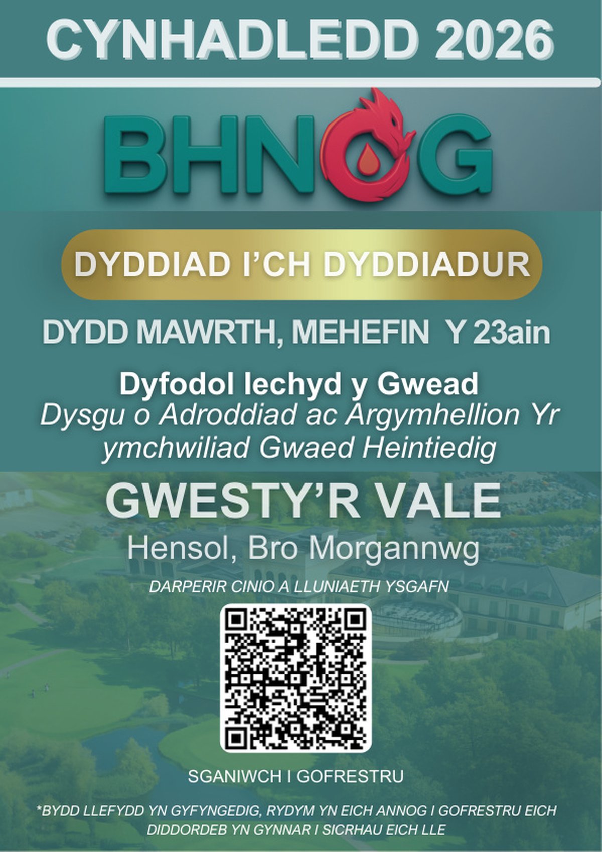 Rydym yn falch iawn o gyhoeddi y bydd Cynhadledd BHNOG 2026 yn cael ei chynnal ddydd Mawrth, 23 Mehefin, yng Ngwesty'r Vale Resort.